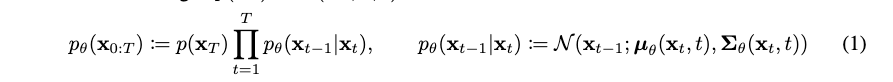 - : 역방향 과정(Reverse process)에서 로부터 을 생성하는 확률