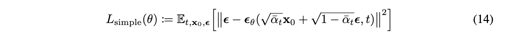- 시점에서 만들어진 를 모델의 입력으로 넣으면, 모델 이 noise 만 예측, 분리해 낼 수 있는지를 보는 Loss로 바뀜.