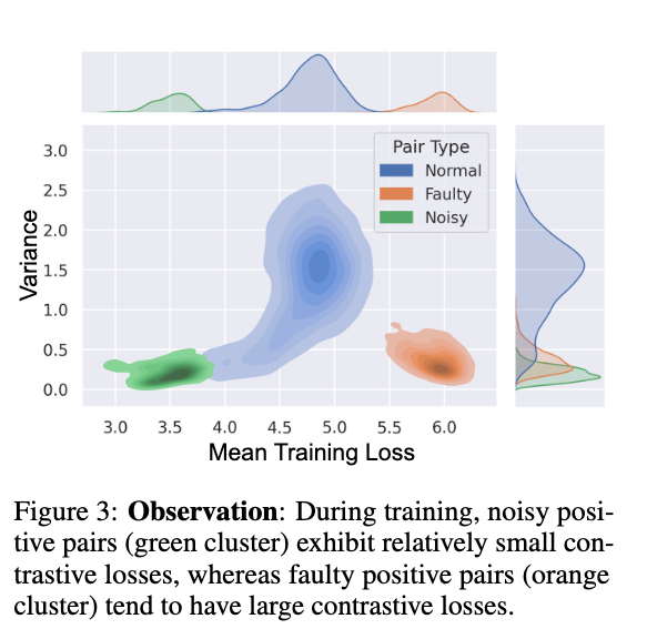 • In contrast, faulty positive pairs are often associated with large contrastive loss and small variance during training (the orange cluster), which implies that the faulty positive pair is difficult to align.